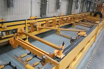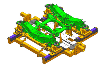 該工裝用于350公里動(dòng)車(chē)組車(chē)體底架的翻轉(zhuǎn),將底架鋼結(jié)構(gòu)翻轉(zhuǎn)一定角度,使得焊縫處于平焊位置,而且配合設(shè)計(jì)可以電動(dòng)升降的小車(chē),從而方便焊接操作,保證焊接質(zhì)量。